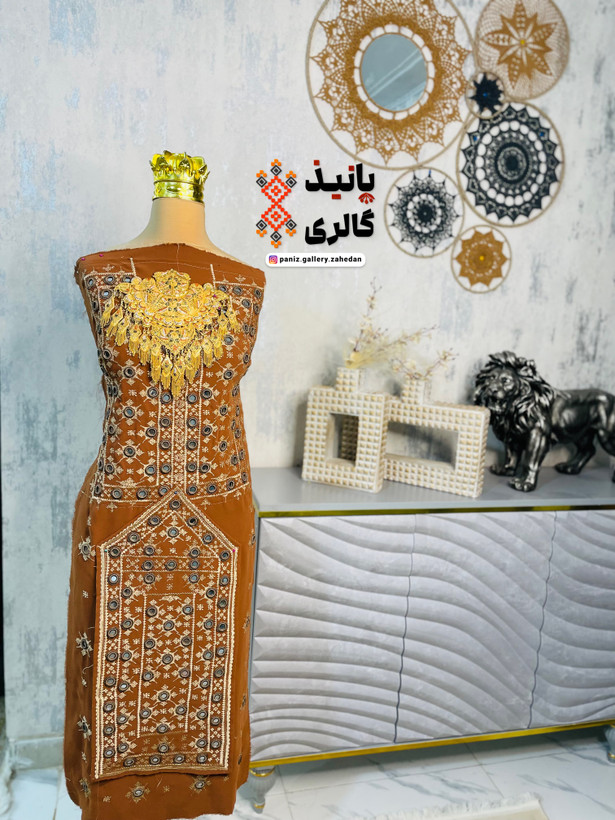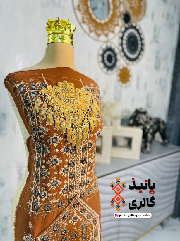 لباس به صورت ترکیبی از دوخت چرخ و دست آماده شده است؛ زمینه لباس با چرخ و حلقههای دور آینه با دست دوخته شدهاند تا ظرافت و دوام بیشتری داشته باشد.