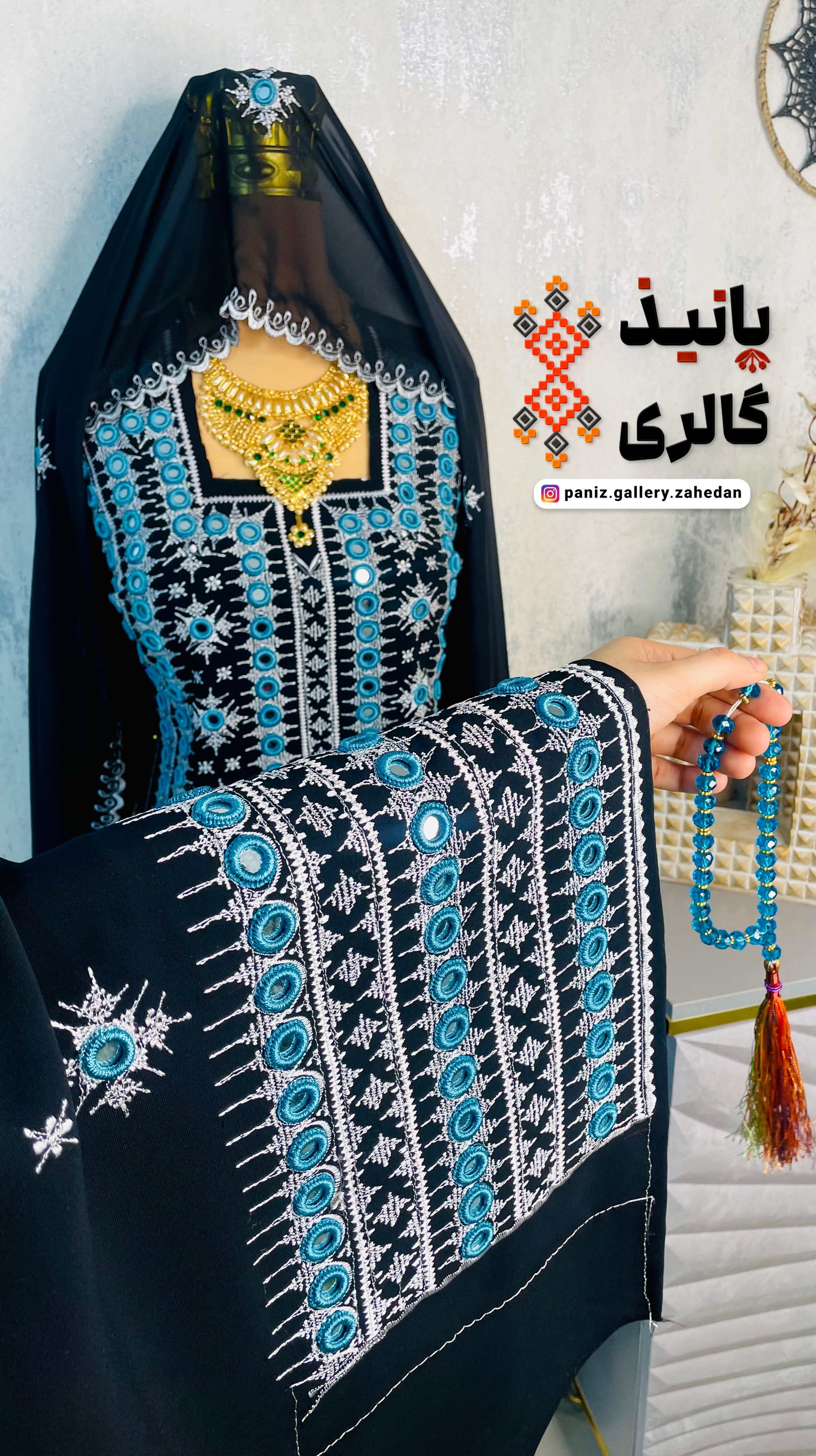 لباس به صورت ترکیبی از دوخت چرخ و دست آماده شده است؛ زمینه لباس با چرخ و حلقههای دور آینه با دست دوخته شدهاند تا ظرافت و دوام بیشتری داشته باشد.