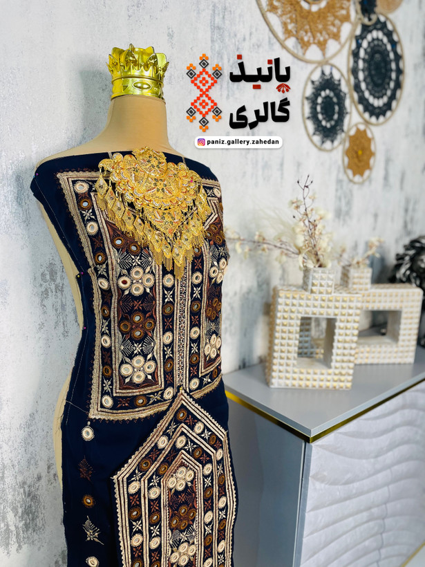 لباس به صورت ترکیبی از دوخت چرخ و دست آماده شده است؛ زمینه لباس با چرخ و حلقههای دور آینه با دست دوخته شدهاند تا ظرافت و دوام بیشتری داشته باشد.