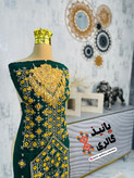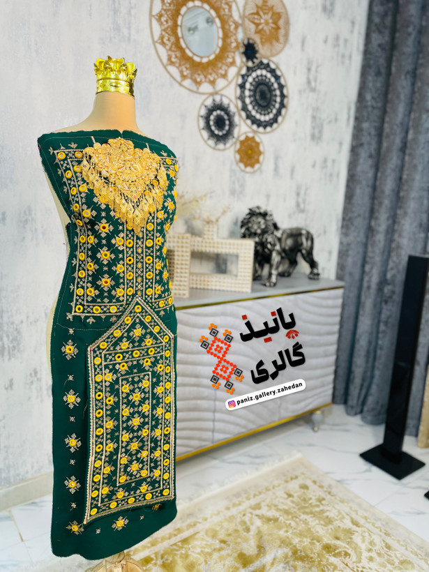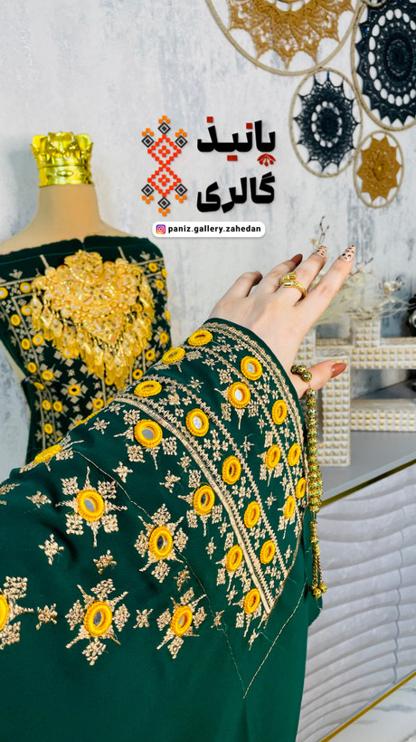 لباس به صورت ترکیبی از دوخت چرخ و دست آماده شده است؛ زمینه لباس با چرخ و حلقه های دور آینه با دست دوخته شدهاند تا ظرافت و دوام بیشتری داشته باشد.
